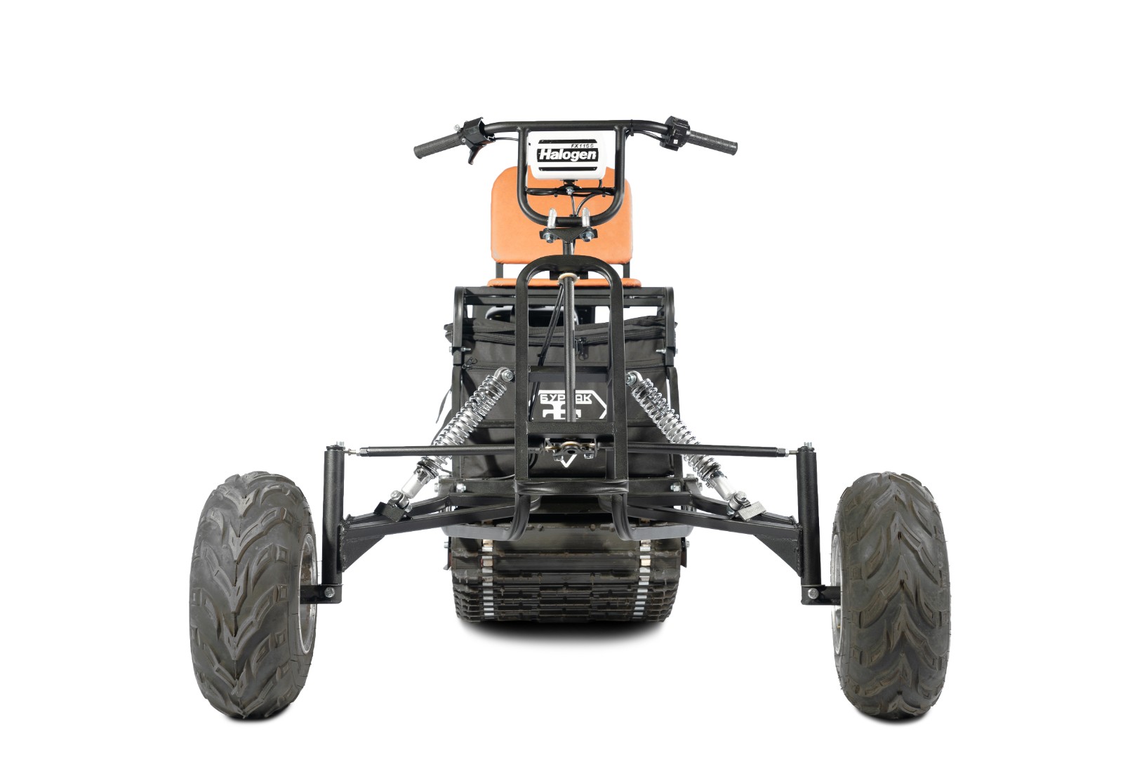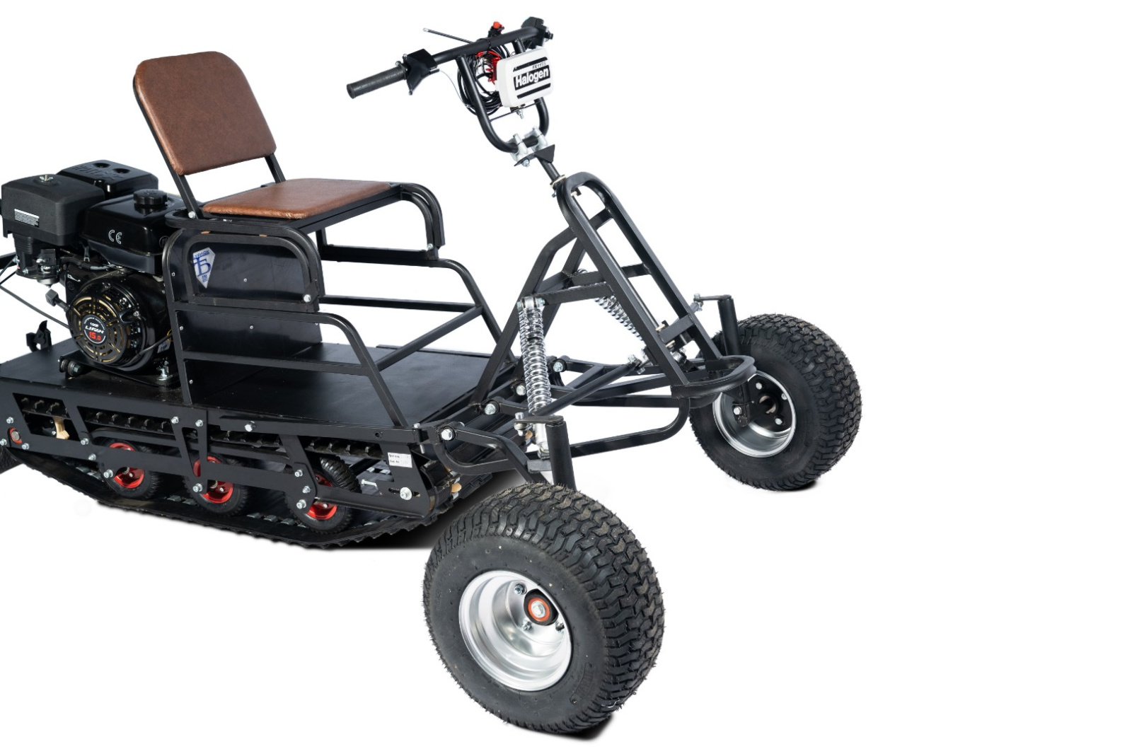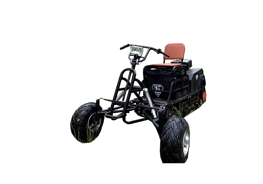 Комплектуется качественными колесами, амортизаторами импортного производства, складным креслом из бакфанеры 8 мм, покрытой поролоном и обитой качественным кожзаменителем, светодиодной фарой. Светодиодная фара комплектуется фирменным пластиковым чехлом, позволяющим сохранить фару целой при транспортировке. Профилированная труба покрывается порошковой эмалью.