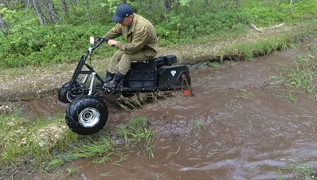 При установке колесного модуля от компании "Снегоход-Сервис" в комплекте с коробкой реверса покупатель получает аналог разборного снегохода, который легко преодолевает любые препятствия и способен развивать скорость до 45 км/ч.